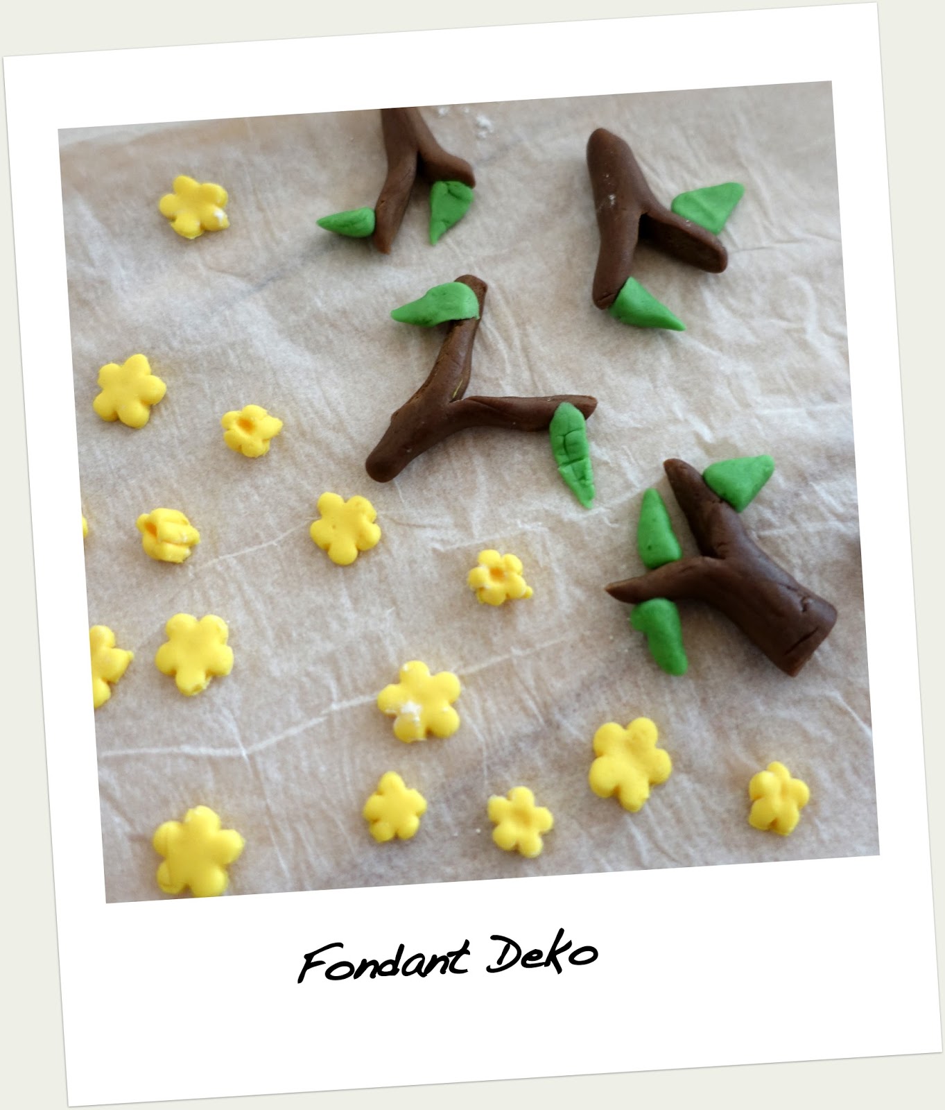 Für die Deko wurde Fertig-Dekor verwendet, dieser aber mit Fondant aufgehübscht: Die Fliegenpilze bekommen einen weißen Stamm, die Eule einen Ast mit Blättern und die Marienkäfer ein paar gelbe und lila Blümchen. Mindestens 30 min trocknen lassen.