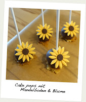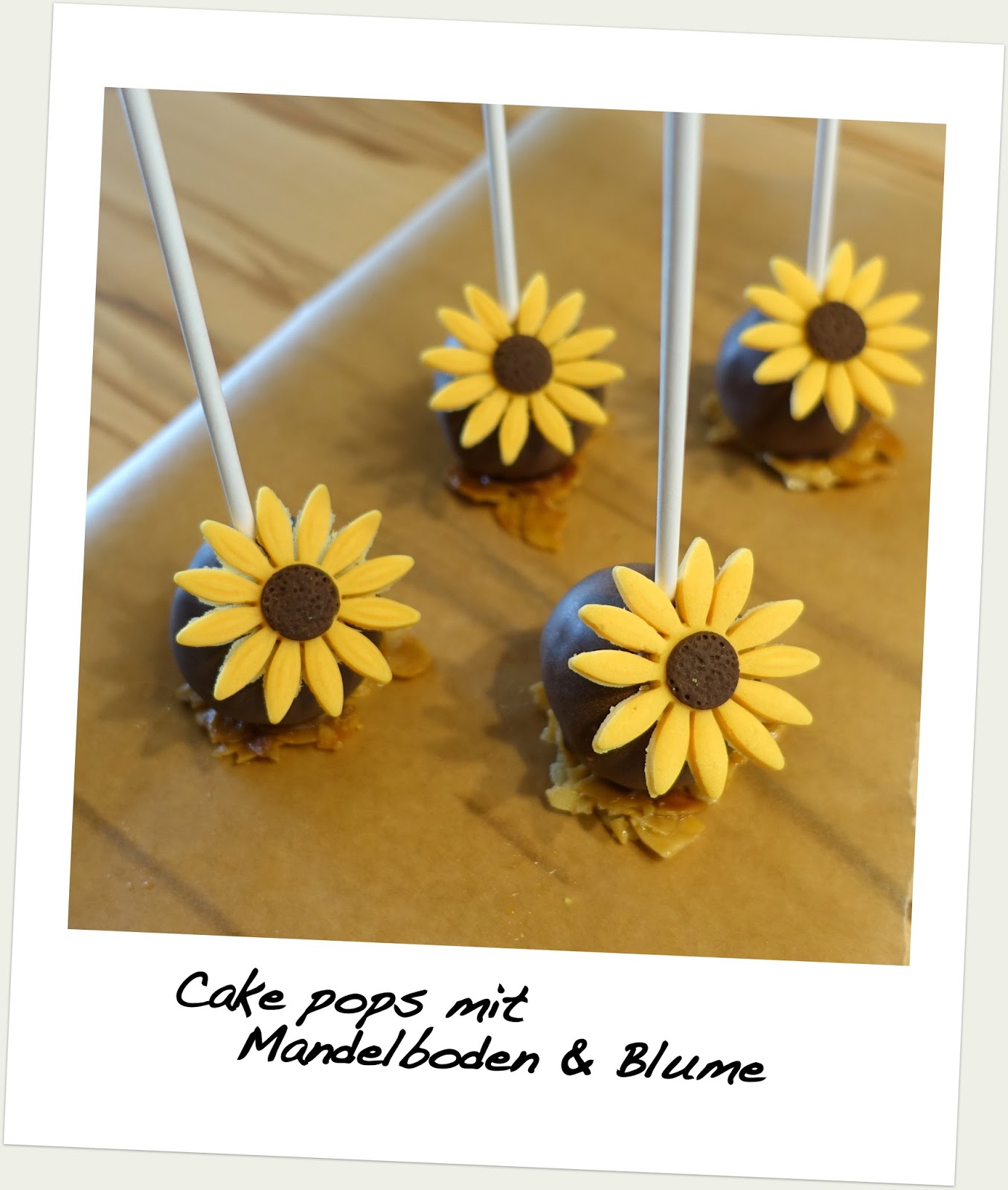 Die vorbereiteten Mandelkrusten-Stücke auf dem Backpapier auflegen, die Cake pops darauf setzen und mit einer Fondant-Blume versehen. Gut aushärten lassen.