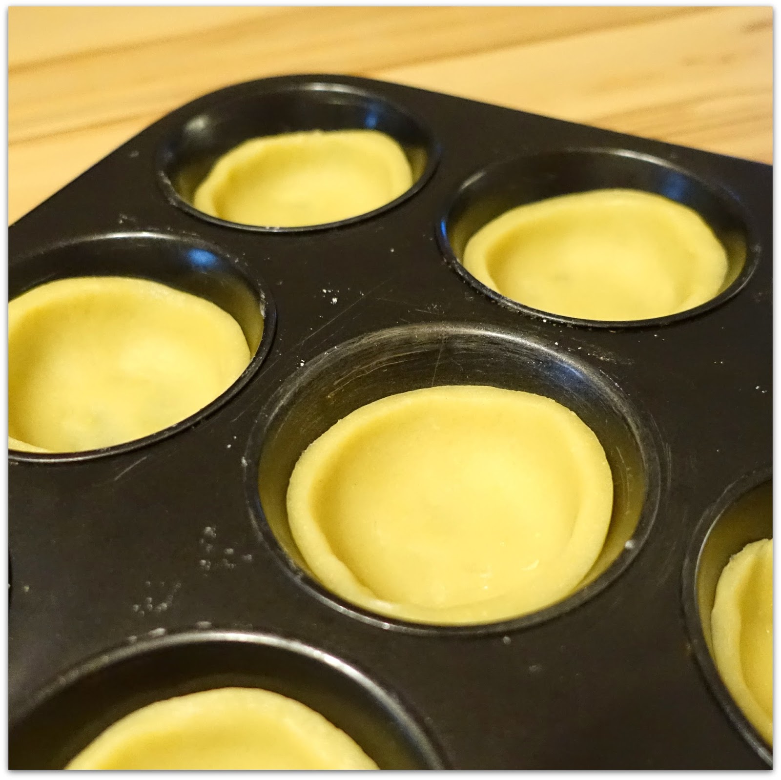 Tartelettes- oder Muffin-Formen mit etwas Butter einfetten. Mürbteig auf bemehlter Arbeitsfläche 3-4 mm dick ausrollen. Kreise, etwas größer als die Tartelettes- oder Muffin-Förmchen ausstechen. Teig-Kreise in die Förmchen setzen und vor allem an den seitlichen Wänden, etwas andrücken.