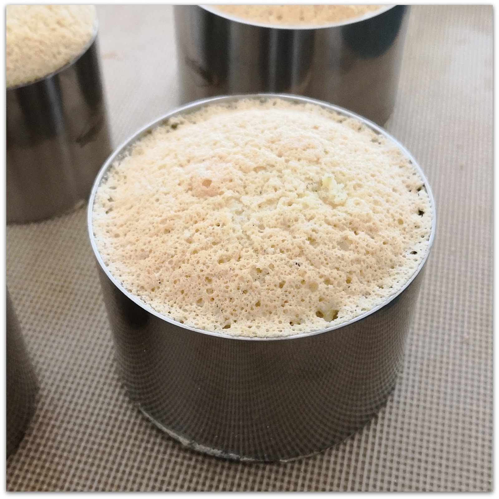Für den Biskuitteig Eier trennen. Dotter mit Staubzucker und Vanillezucker schaumig schlagen. Mehl, Stärke und Zesten einer 1/2 Zitrone in einer weiteren Schüssel vermischen. Saft der Zitrone auspressen und unter die Dotter-Zucker-Masse mengen. Dann abwechselnd die trockenen Zutaten und das zu Schnee ausgeschlagene Eiklar unter die Masse heben. Backrohr auf 180°C Ober-/Unterhitze vorheizen.Backblech mit Papier auslegen und die Speiseringe aufsetzen. Die Biskuitmasse auf die Formen verteilen. 20 min backen.