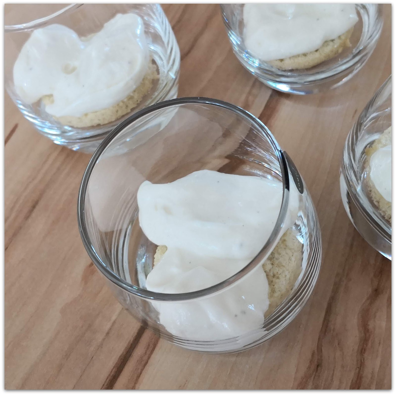 Biskuitteig je 2-3x horizontal durchschneiden. Dann mit einem Biskuitteil beginnen und in ein breites Glas setzen. Einen Esslöffel Creme darauf verteilen, dann ein paar Früchte und einen Teelöffel Beerensoße. Dann noch je eine Schicht Biskuit, Creme, Soße und dann mit ein paar Beeren als Deko abschließen.