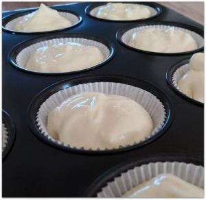 In der Zwischenzeit die Cheesecake-Fülle vorbereiten: Frischkäse, Ricotta, Zucker, Stärke, Saft einer Halben Zitrone und das Vanilleextrakt vermischen. Eier zugeben und glatt rühren. Je einen gehäuften Esslöffel der Creme auf einen der vorgebackenen Lebkuchenböden verteilen. Ein hohes Backblech ca. 3 cm hoch mit heißem Wasser füllen und ins Rohr stellen. Vorsichtig die Muffinform mit den Cheesecake Küchlein im Wasser platzieren und dann für 20 min backen. Nach Ablauf der Backzeit Temperatur zurückdrehen, die Türe einen Spalt öffnen (z.B. einen Holzkochlöffel in die Türe stecken) und so ca. 10 min im Rohr auskühlen lassen. Dann aus dem Rohr holen und für mindestens 3 weitere Stunden im Kühlschrank auskühlen lassen.